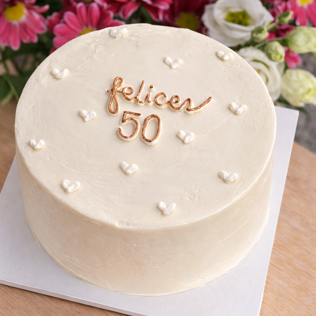 Nuestra mini tarta con base blanca, corazones blancos y la frase en color dorado aportando un toque elegante y luminoso.