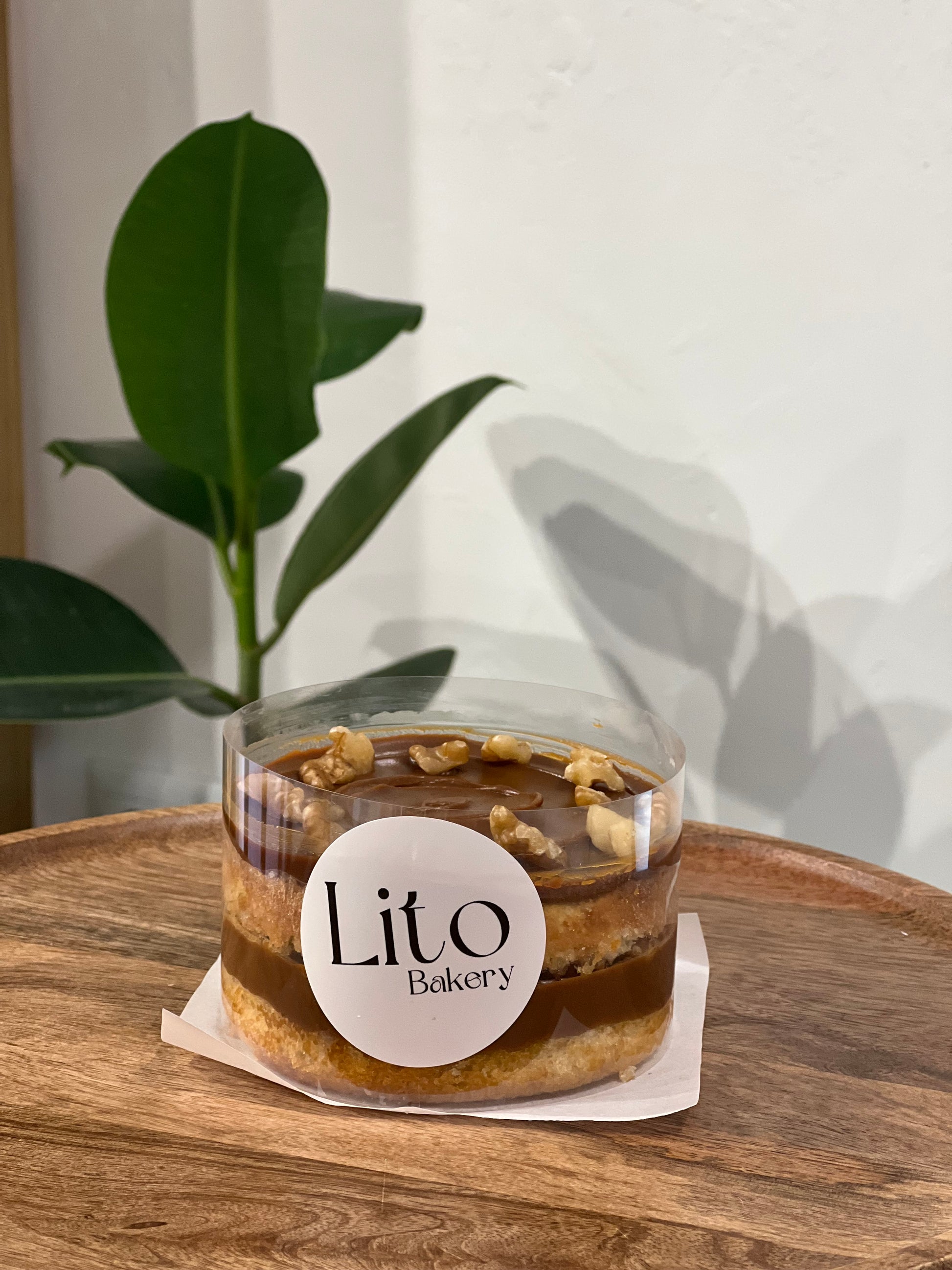 Bizcocho de vainilla relleno de dulce de leche con nueces.